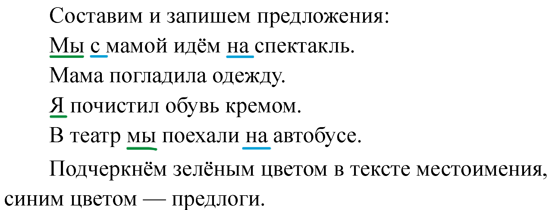 Подчеркни зелёным цветом в тексте местоимения, синим цветом — предлоги.