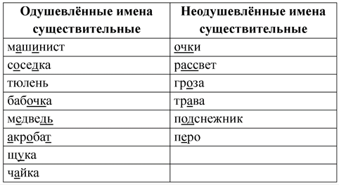 Запишем в таблицу имена существительные: