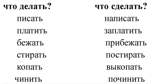 Писать (пишет) — написать (пишет), платить (платит) — заплатить (платит), бежать (бег) — прибежать (бег), стирать (стирка) — постирать (стирка), копать (вскопка) — выкопать (вскопка), чинить (починка) — починить (починка).