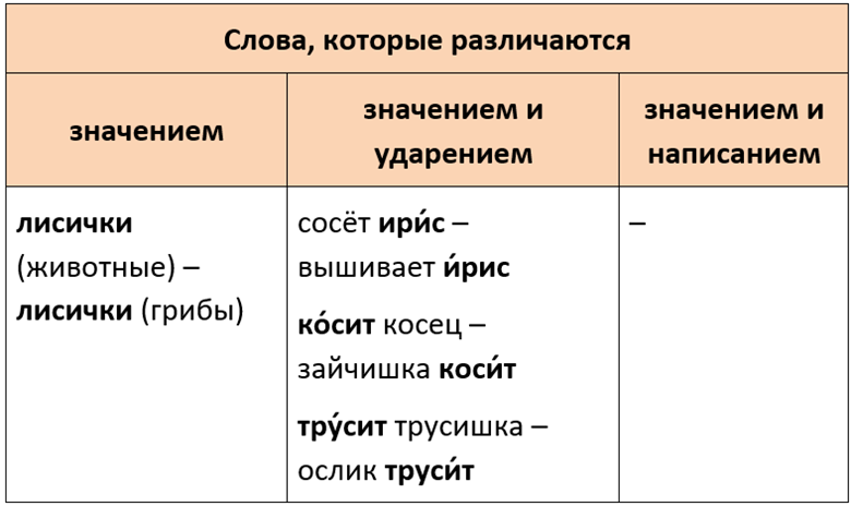 Слова-омонимы могут отличаться друг от друга значением, значением и произношением или значением и написанием.