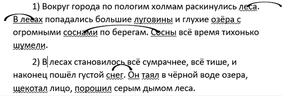 1) Последовательный способ связи предложений. Средства связи предложений: повтор слов (леса –> в лесах, с соснами –> сосны).
