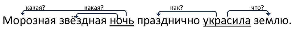 II. Словосочетания: ночь (какая?) морозная, ночь (какая?) звездная, украсила (как?) празднично, украсила (что?) землю.