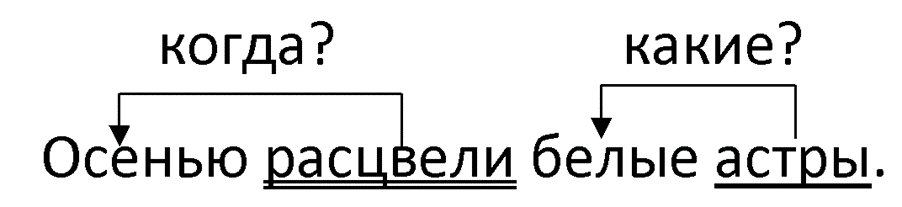 5. Найдём второстепенный член предложения, который поясняет подлежащее. Поставим от подлежащего вопрос: астры (какие?) белые. Найдём второстепенный член предложения, который поясняет сказуемое. Поставим от сказуемого вопрос: расцвели (когда?) осенью.