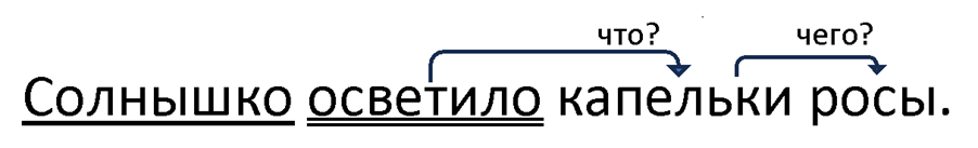 II. Словосочетания: осветило (что?) капельки, капельки (чего?) росы.