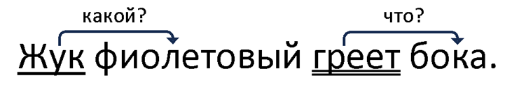 II. Словосочетания: жук (какой?) фиолетовый, греет (что?) бока.