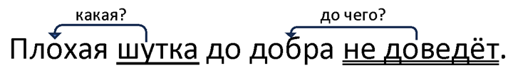 II. Словосочетания: шутка (какая?) плохая, не доведет (до чего?) до добра.