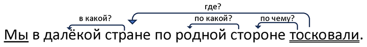 II. Словосочетания: тосковали (где? в чем?) в стране, тосковали (по чему?) по стороне, в стране (какой?) далекой, по стороне (какой?) родной.