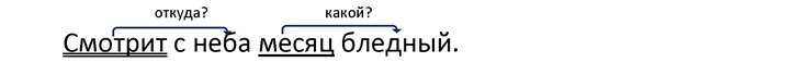 II. Словосочетания: смотрит (откуда? с чего?) с неба, месяц (какой?) бледный.