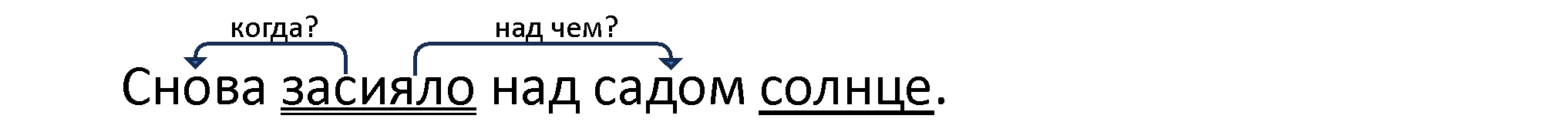 II. Словосочетания: засияло (когда?) снова, засияло (над чем? где?) над садом.