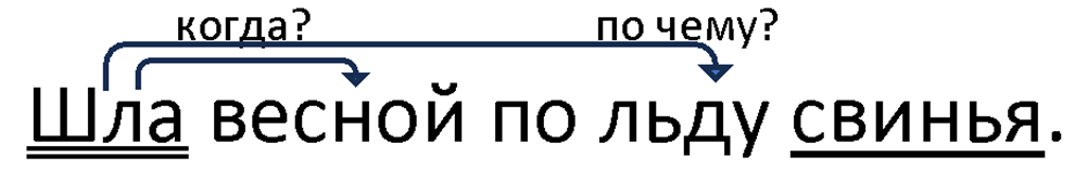 II. Словосочетания: шла (когда?) весной, шла (где? по чему?) по льду.