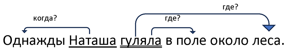 II. Словосочетания: гуляла (когда?) однажды, гуляла (где?) в поле, гуляла (где? около чего?) около леса.