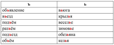 Объявление (разделит. ъ после приставка на согл. перед корнем на я), въезд (разделит. ъ после приставка на согл. перед корнем на е), подъём (разделит. ъ после приставка на согл. перед корнем на ё), вьюга (разделит. ь в корне перед ю), крылья (разделит. ь в корне перед я), веселье (разделит. ь в корне перед е), пролёт (приставка на гласную, а корне на согласную, между ними не ставится разделит. ъ), разъём (разделит. ъ после приставка на согл. перед корнем на ё), зимовье (разделит. ь в корне перед е), подъезд (разделит. ъ после приставка на согл. перед корнем на е), обезьяна (разделит. ь в корне перед я), келья (разделит. ь в корне перед я), объём (разделит. ъ после приставка на согл. перед корнем на ё).