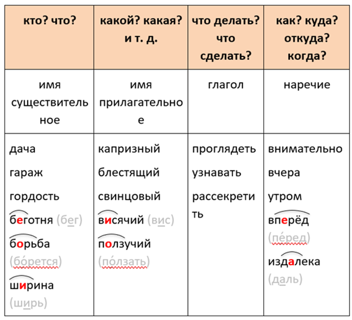 Существительные имеют общее грамматическое значение предмета, прилагательные – признака предмета, глаголы – действия, наречия – признака действия.