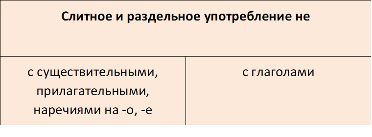 Правила слитного и раздельного написания не с существительными, качественными прилагательными и наречиями на о/е совпадают, поэтому они записаны в одну графу. У глагола правило другое, поэтому он вынесен в отдельный столбик.