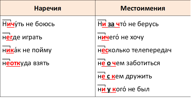 Сходство в написании не и ни в наречиях и местоимениях: выбор букв е или и в данных примерах зависит от ударения: под ударение пишется е, без ударения — и.