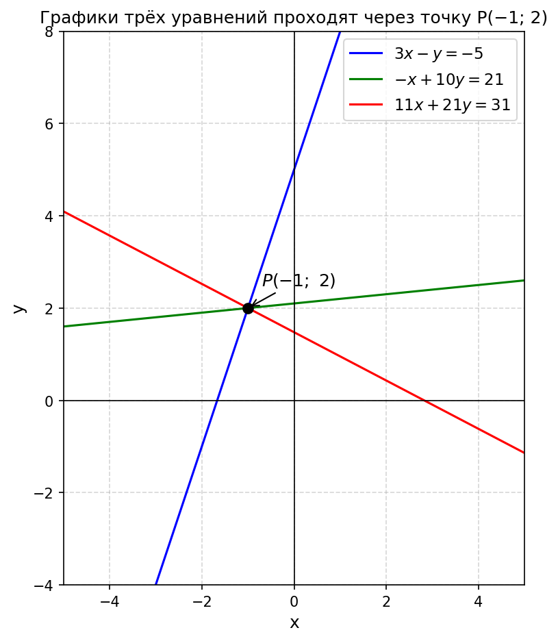Условие: Докажите, что графики уравнений $3x - y = -5$, $-x + 10y = 21$, $11x + 21y = 31$ проходят через точку $P(-1; 2)$.