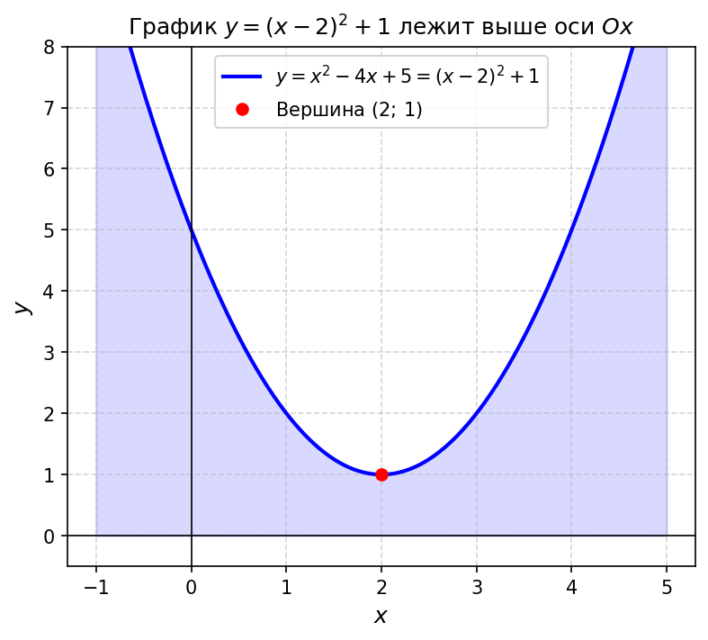 Условие: Докажите, что все точки графика функции, заданной формулой $y = x^2 - 4x + 5$, расположены в верхней полуплоскости.