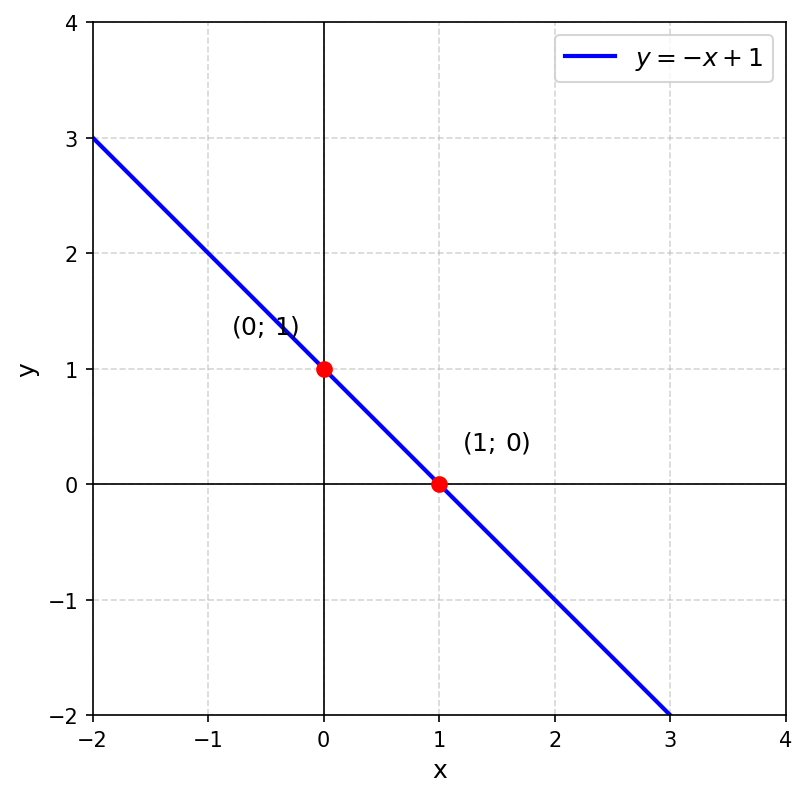 График: прямая, проходящая через точки приблизительно $(0;\, 1)$ и $(1;\, 0)$, убывающая, $f(x) = -x + 1$.