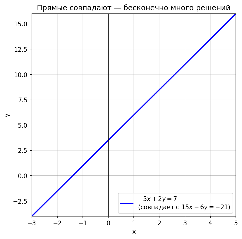 Получили верное равенство. Это означает, что уравнения системы задают одну и ту же прямую (второе уравнение получается из первого умножением на ). Значит, система имеет бесконечно много решений — решением является любая пара