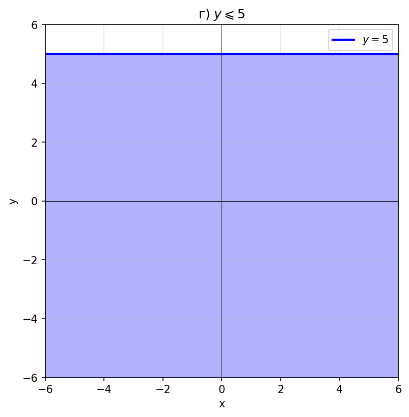 Проведём прямую . Ордината любой точки, принадлежащей этой прямой или расположенной ниже неё, равна 5 или меньше 5. Значит, неравенство задаёт прямую
