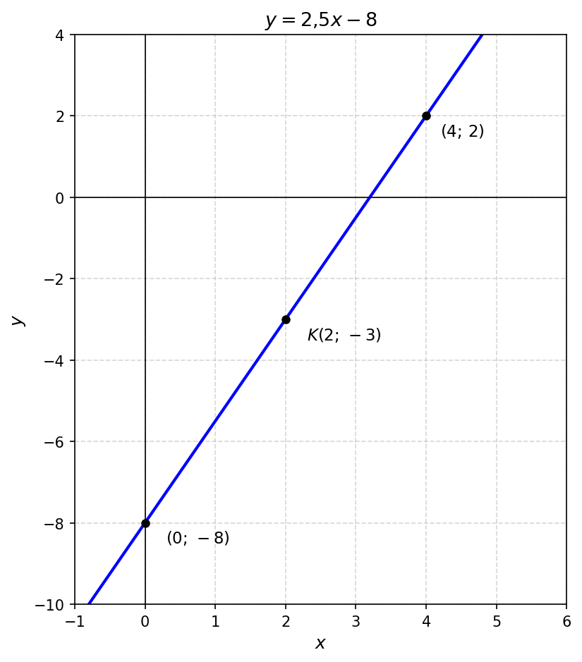 Условие: Постройте прямую, которая является графиком уравнения $y - 2{,}5x = c$, если известно, что она проходит через точку $K(2;\, -3)$.