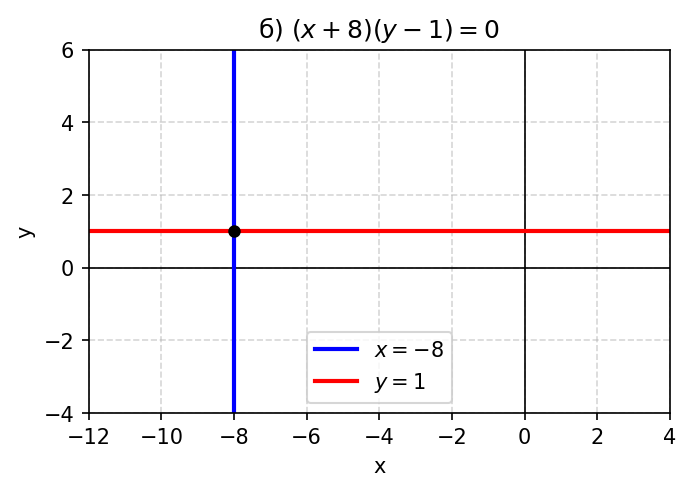 б) $(x + 8)(y - 1) = 0$;