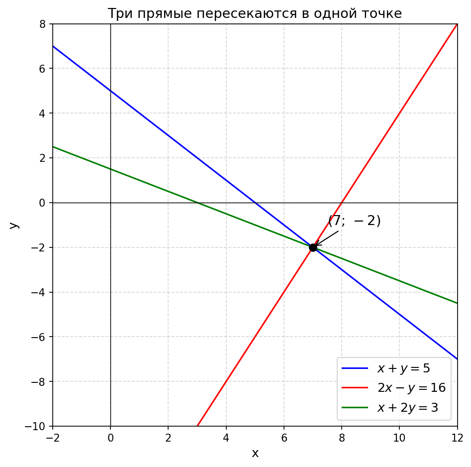 Условие: Докажите, что прямые $x + y = 5$, $2x - y = 16$ и $x + 2y = 3$ пересекаются в одной точке. Каковы координаты этой точки?
