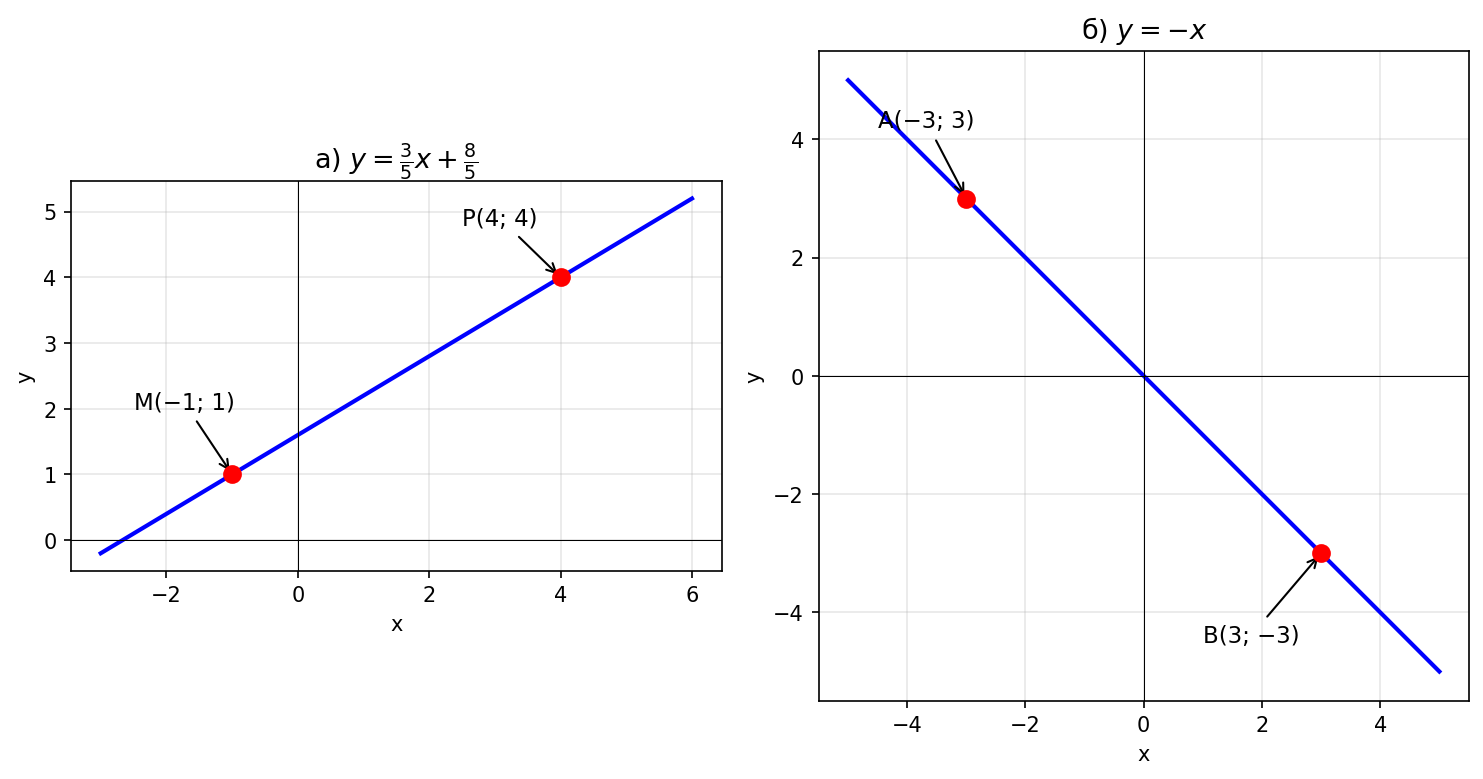 Условие: *(Для работы в парах.)* Напишите уравнение вида $y = kx + b$, график которого проходит через точки: а) $M(-1; 1)$ и $P(4; 4)$; б) $A(-3; 3)$ и $B(3; -3)$.