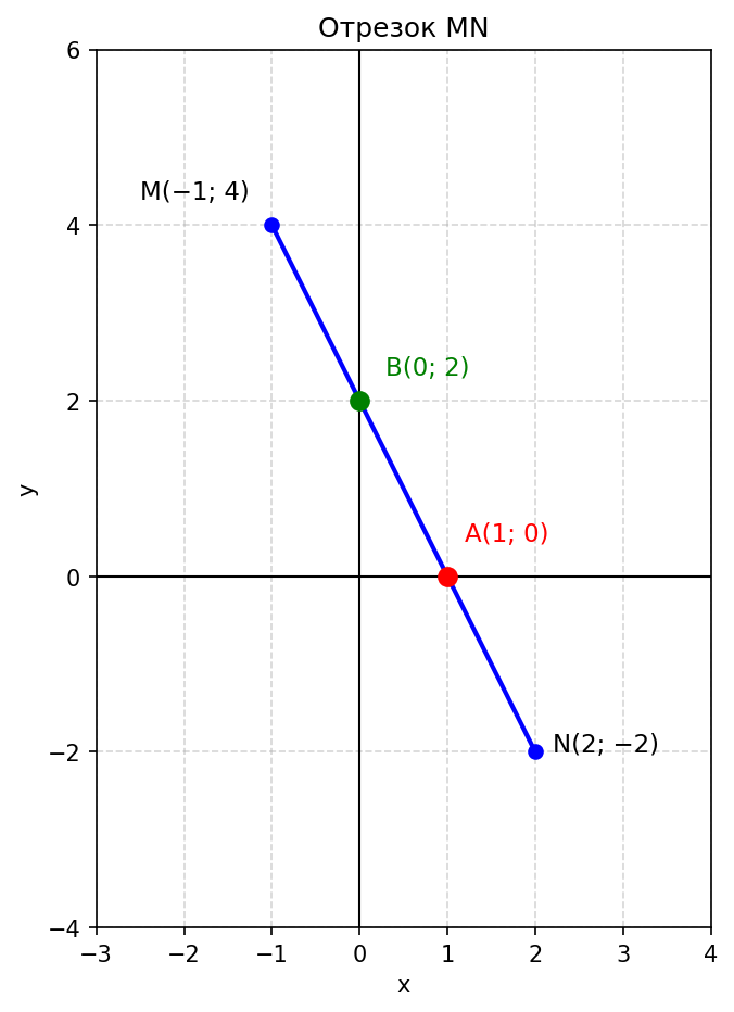 Условие: Постройте на координатной плоскости отрезок $MN$, зная координаты его концов: $M(-1; 4)$ и $N(2; -2)$. Найдите координаты точек пересечения этого отрезка с осью $x$ и с осью $y$.