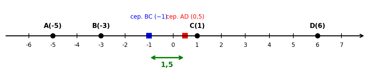 Условие: На координатной прямой отмечены точки $A(-5)$, $B(-3)$, $C(1)$ и $D(6)$. Найдите расстояние между серединами отрезков $AD$ и $BC$.