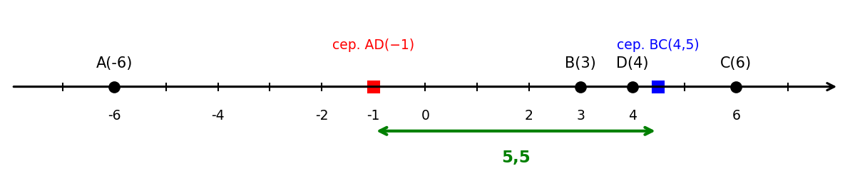 Условие: На координатной прямой отмечены точки $A(-6)$, $B(3)$, $C(6)$ и $D(4)$. Найдите расстояние между серединами отрезков $AD$ и $BC$.