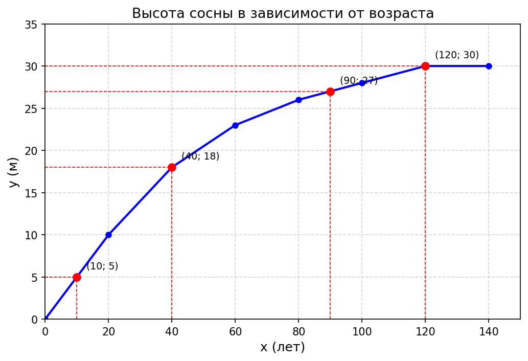 Ответ: а) 5 м; 18 м; 27 м; 30 м; б) за промежуток от 20 до 60 лет сосна выросла на 13 м, за промежуток от 70 до 120 лет — на 5,5 м.