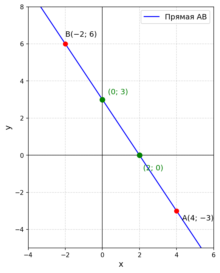 Условие: Отметьте точки $A(4; -3)$ и $B(-2; 6)$. Проведите прямую $AB$ и найдите координаты точек пересечения этой прямой с осью $x$ и осью $y$.