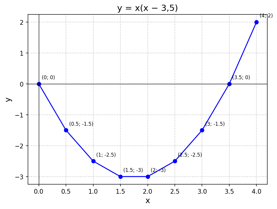 Условие: Составьте таблицу значений функции, заданной формулой $y = x(x - 3{,}5)$, где $0 \leqslant x \leqslant 4$, с шагом $0{,}5$.