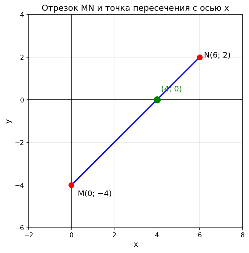 Условие: Отметьте в координатной плоскости точки $M(0; -4)$ и $N(6; 2)$ и соедините их отрезком. Найдите координаты точки пересечения этого отрезка с осью $x$.