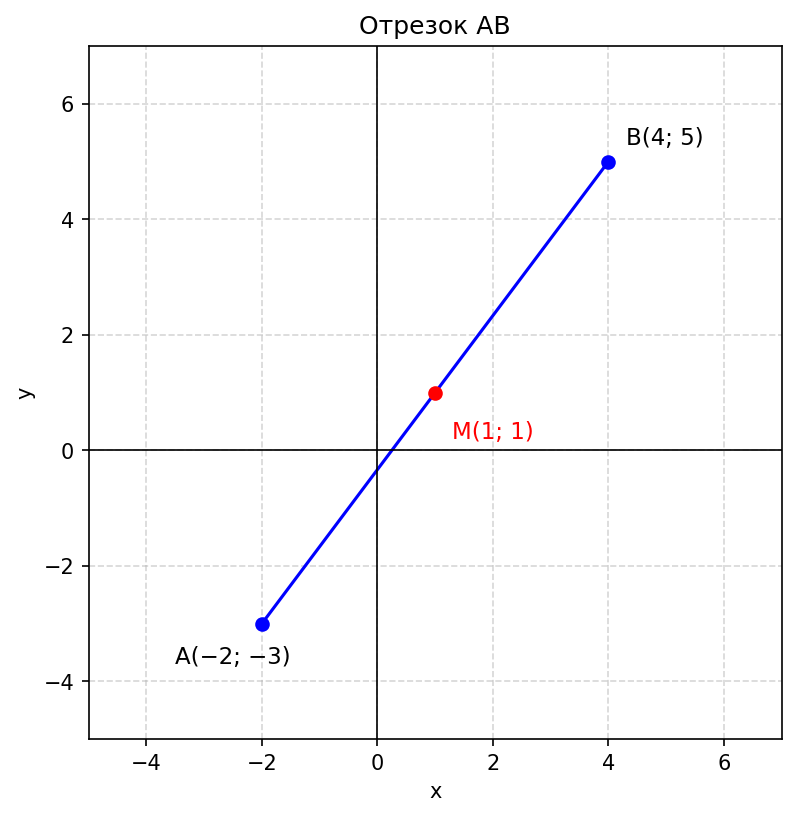 Условие: Отметьте в координатной плоскости точки $A(-2; -3)$ и $B(4; 5)$ и соедините их отрезком. Найдите координаты середины отрезка $AB$.