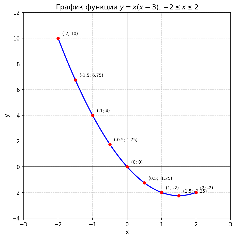 Условие: Функция задана формулой $y = x(x - 3)$, где $-2 \leqslant x \leqslant 2$. Перечертите в тетрадь таблицу, заполните и постройте график функции.