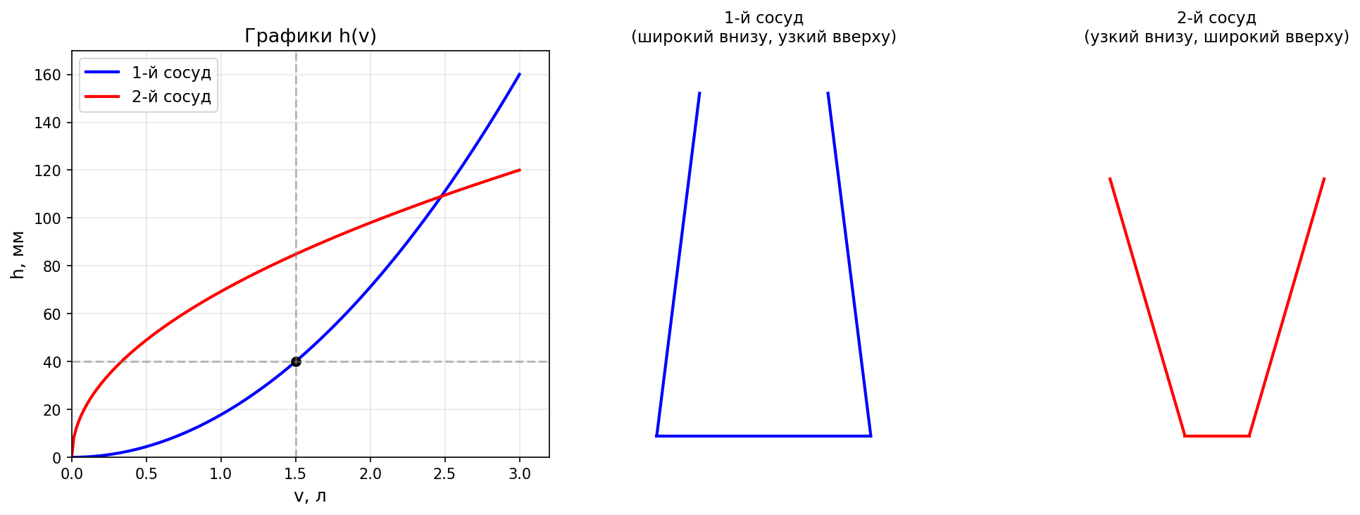 Однако вопрос звучит: «какое количество жидкости надо налить в каждый сосуд, чтобы уровень был одинаков». Это означает — найти точку, где графики пересекаются, то есть при одном и том же объёме высота одинакова.