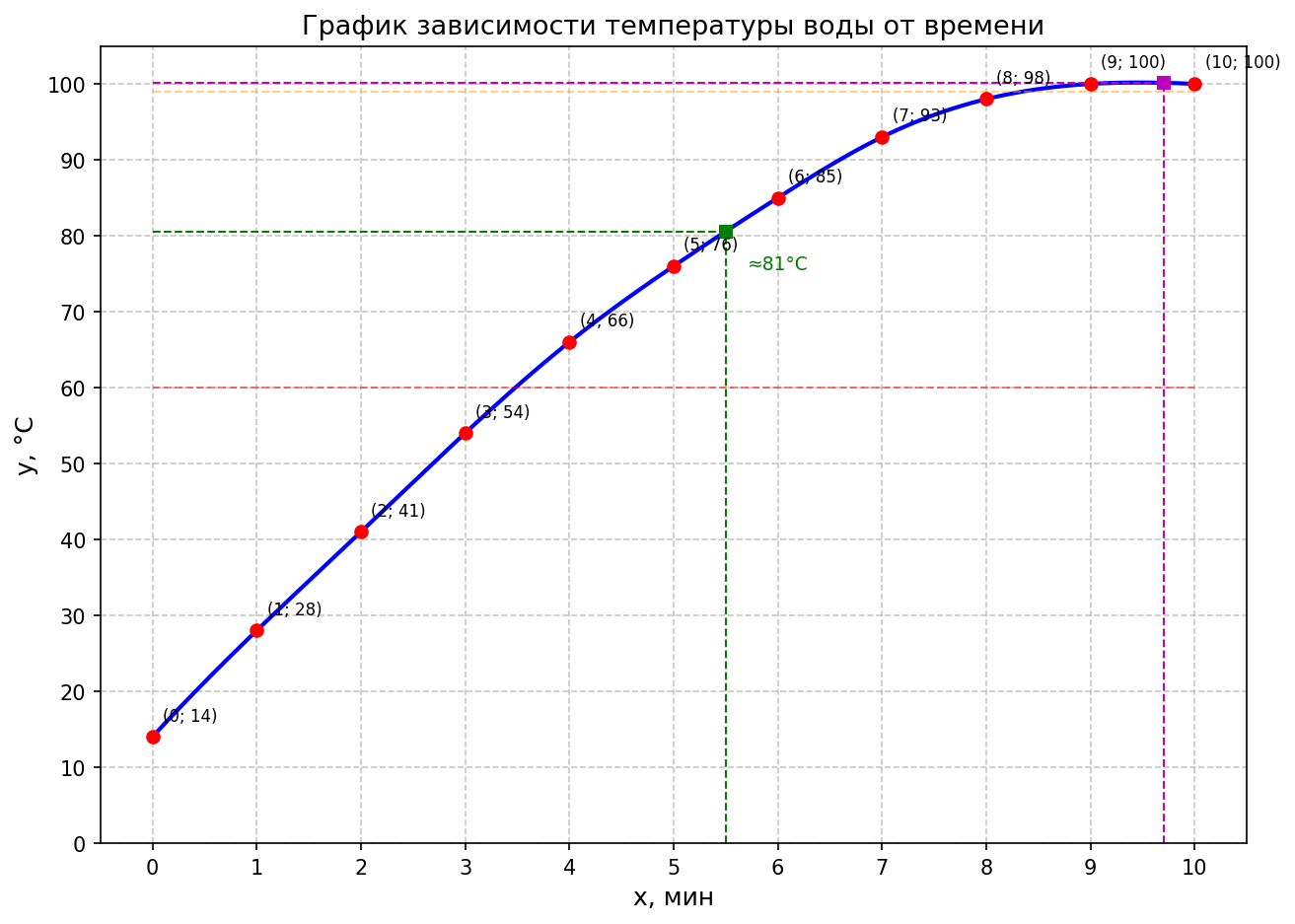 Постройте график зависимости $y(x)$ (масштаб: 1 см на оси $x$ соответствует 1 мин, 1 см на оси $y$ соответствует 10 °C). Используя график, ответьте на вопросы: