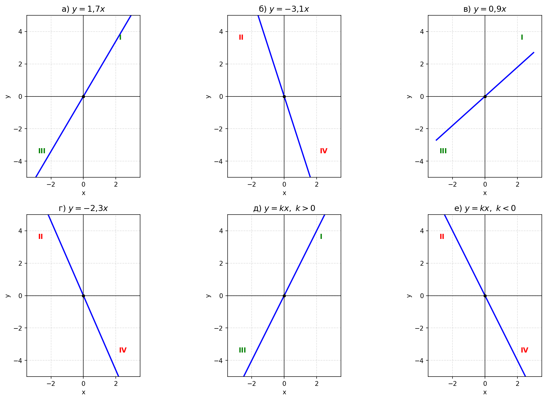 б) $y = -3{,}1x$; г) $y = -2{,}3x$; е) $y = kx$, где $k < 0$.