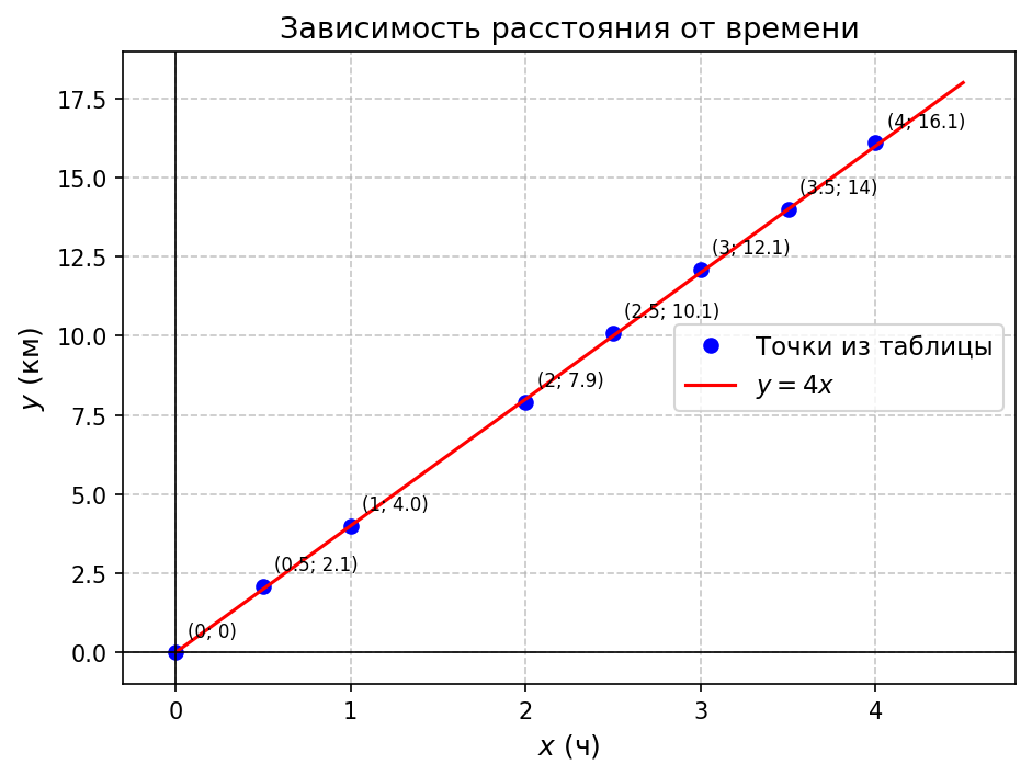 Это означает, что турист шёл с примерно постоянной скоростью 4 км/ч.