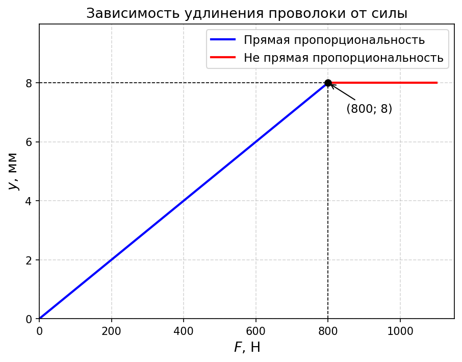 На рисунке 38 видно, что график выходит из начала координат и является прямой линией (линейно растёт) при значениях силы от 0 до 800 Н. При Н график становится горизонтальным (удлинение не меняется), то есть зависимость перестаёт быть прямой пропорциональностью.