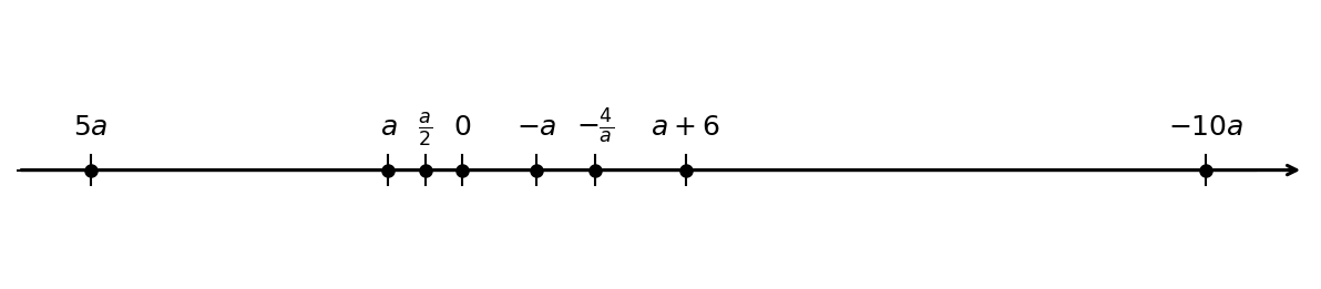 Условие: На координатной прямой (рис. 39) отмечено число $a$. Расположите в порядке возрастания числа $5a$; $-10a$; $a + 6$; $-a$; $\dfrac{a}{2}$; $-\dfrac{4}{a}$.