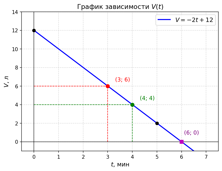 Условие: Из бака ёмкостью 12 л, наполненного доверху водой, равномерно вытекает вода. График зависимости $V$ от $t$, где $V$ — объём воды в баке (в литрах), а $t$ — время вытекания воды (в минутах), построен на рисунке 53. Пользуясь графиком, найдите: