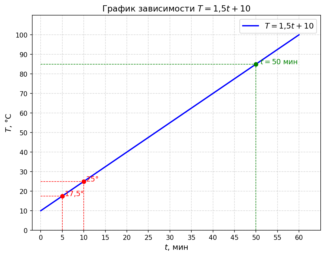Условие: В бак налили воду, температура которой $10^\circ$С, и нагревали её до $100^\circ$С, причём через каждую минуту температура повышалась на $1{,}5^\circ$С. Задайте формулой зависимость температуры воды $T$ (в градусах Цельсия) от времени нагревания $t$ (в минутах). Постройте график этой зависимости. Узнайте по графику: