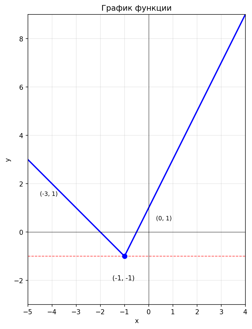 в) Прямая имеет ровно две общие точки с графиком, если она проходит выше вершины (пересекает оба луча):