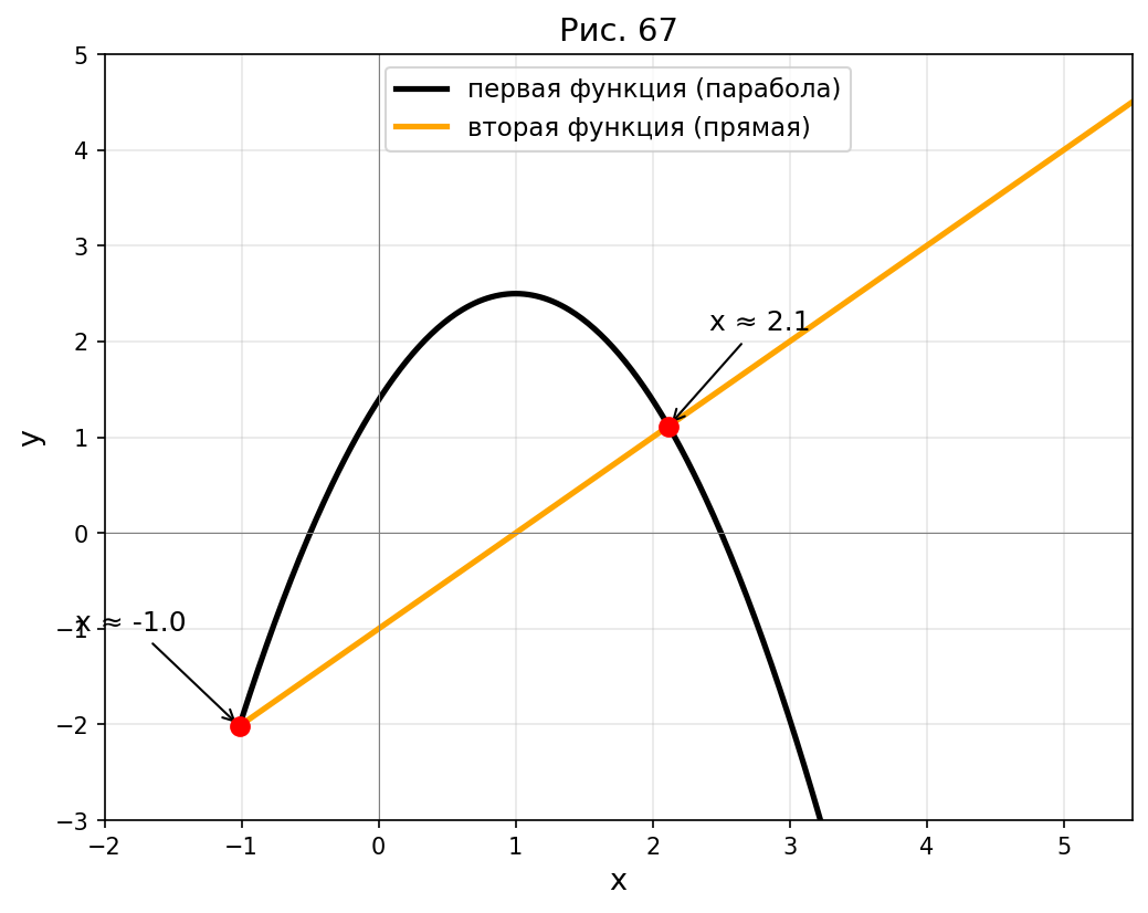 Из графика определяем точки пересечения чёрной (парабола) и цветной (возрастающая кривая) линий. Графики пересекаются в двух точках: при и при