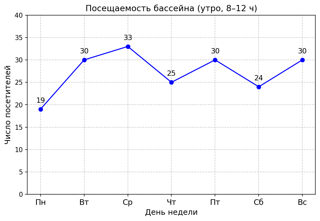 Условие: Из анализа журнала посещаемости бассейна в утреннее время с 8 до 12 часов в течение недели была получена следующая информация. В понедельник было 19 посетителей, а во вторник на 11 человек больше. В среду было на 10% больше, чем во вторник. В четверг было 25 посетителей, а в пятницу на 20% больше, чем в четверг. В воскресенье число посетителей было на 6 человек больше, чем в субботу, и равнялось 30. По данному описанию постройте график зависимости числа посетителей бассейна по дням недели, соединив соседние точки отрезками.