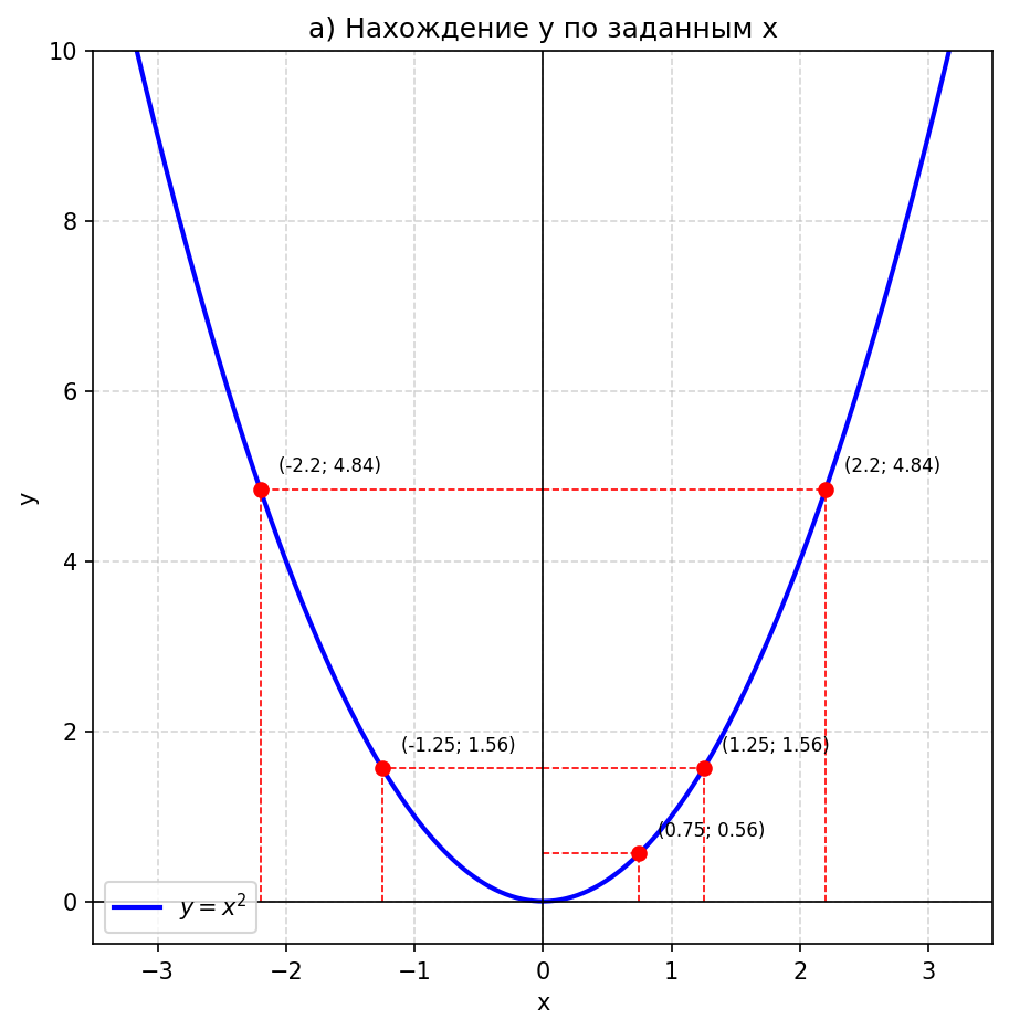 а) значения $y$, соответствующие $x = 0{,}75;\; -1{,}25;\; 1{,}25;\; -2{,}2;\; 2{,}2$;