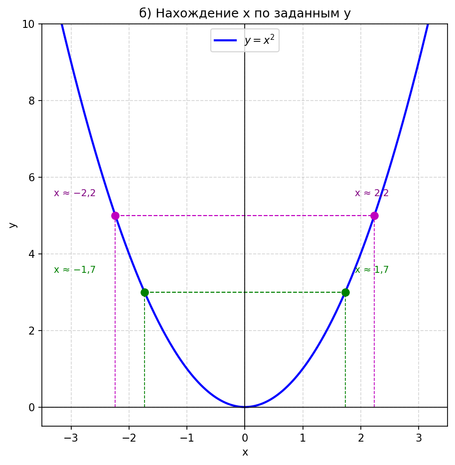 б) значения $x$, которым соответствует $y = 3;\; 5$. Рис. 75 (левый):